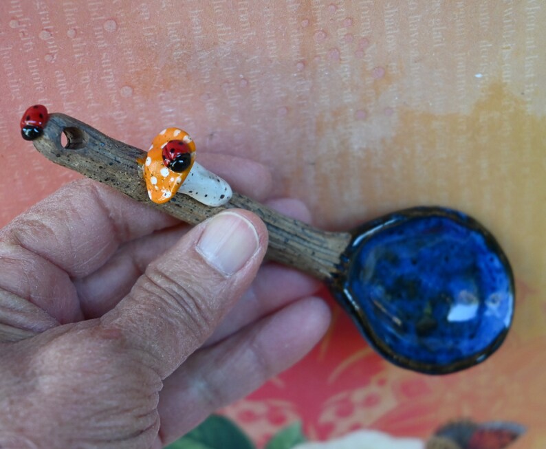 Ceramic spoon. Mushroom spoon. Ladybug spoon. Twig spoon. Wooden ceramic spoon. Whimsical wall art spoon. Pottery spoon. Wall art. Ladybugs