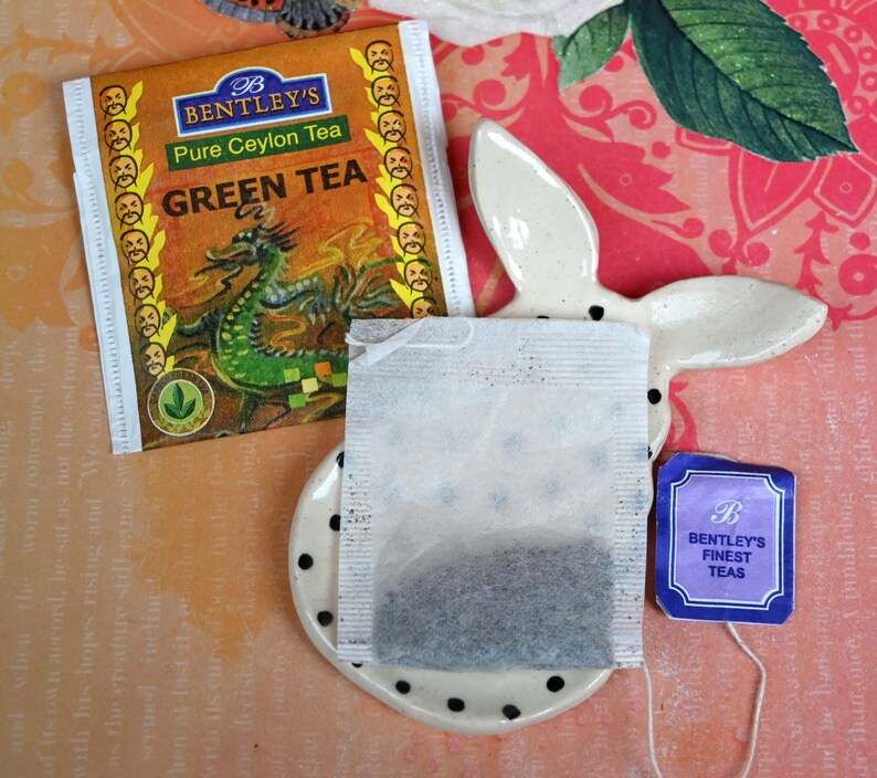 Cotton Tail Bunny ring holder. Polka dot bunny. Tea bag rest. Pill holder. Chopstick rest. Teaspoon rest. Tea light holder. Trinket dish