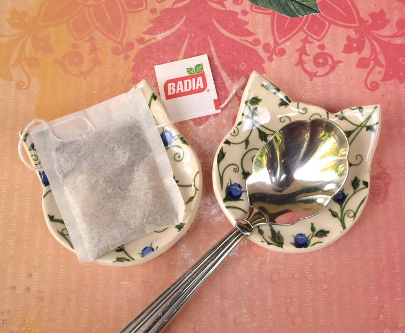 Teeny cat ring holder. Chop stick rest. Teaspoon rest. Tea bag rest. Ceramic cat ring dish. Pill holder. Tea light holder. Blue rose dish.