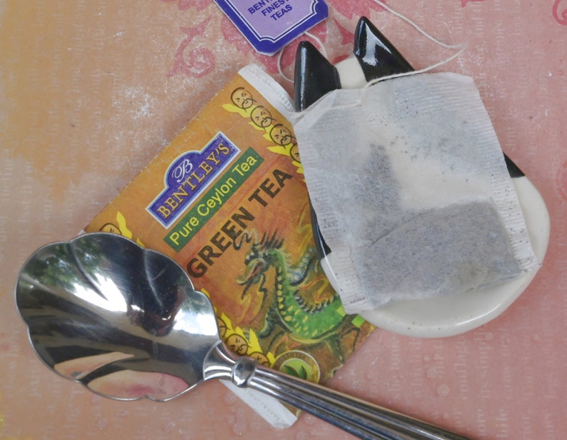 Tuxedo cat ring holder. Cat trinket dish. Teaspoon rest. Tea bag rest. Coffee spoon rest. Pill holder. Chop stick rest. Tea light holder